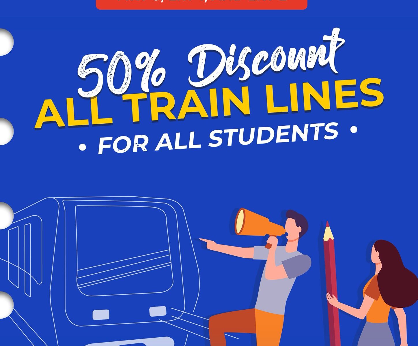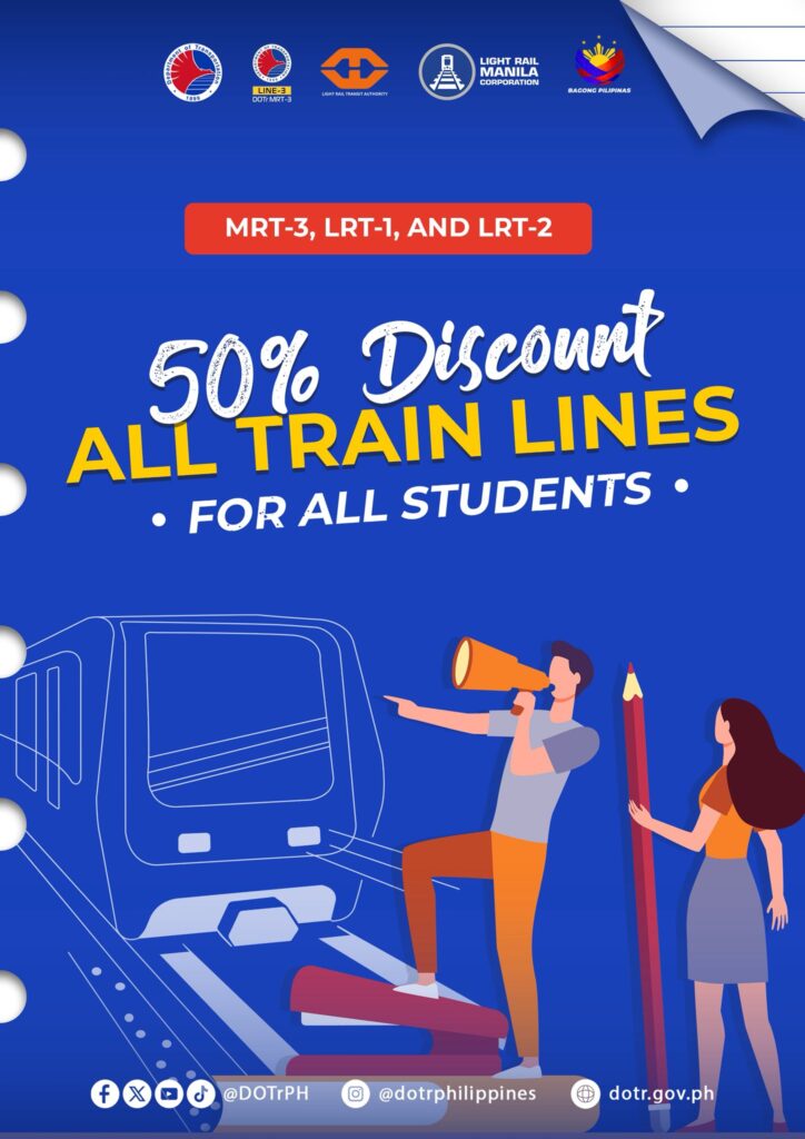 Kasabay ng pagbabalik-eskwela ngayong linggo, inanunsyo ng Department of Transportation (DOTr) na itinaas na sa 50% ang discount sa lahat ng estudyante sa LRT-1, LRT-2 at MRT-3 simula ngayong araw, June 20. see full details here.