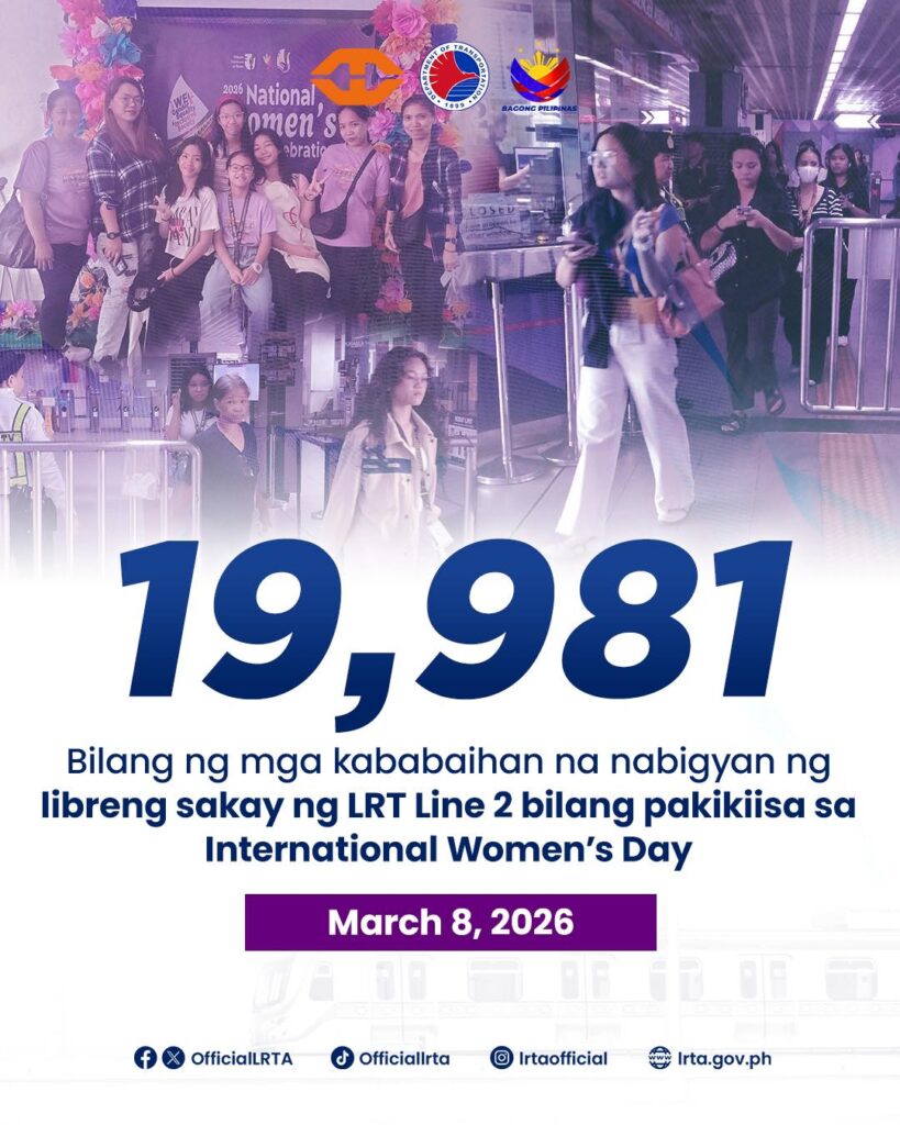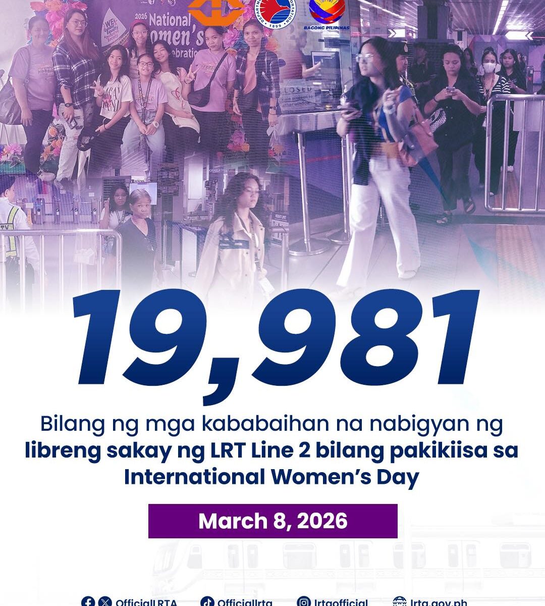 Umabot sa ๐๐,๐๐๐ na mga babaeng pasahero ng LRT-2 ang nakinabang sa ๐๐๐๐๐๐๐ ๐๐๐๐๐ ng Light Rail Transit Authority (LRTA) bilang pakikiisa sa pagdiriwang ng ๐๐ง๐ญ๐๐ซ๐ง๐๐ญ๐ข๐จ๐ง๐๐ฅ ๐๐จ๐ฆ๐๐งโ๐ฌ ๐๐๐ฒ kahapon, Marso 8, 2026.