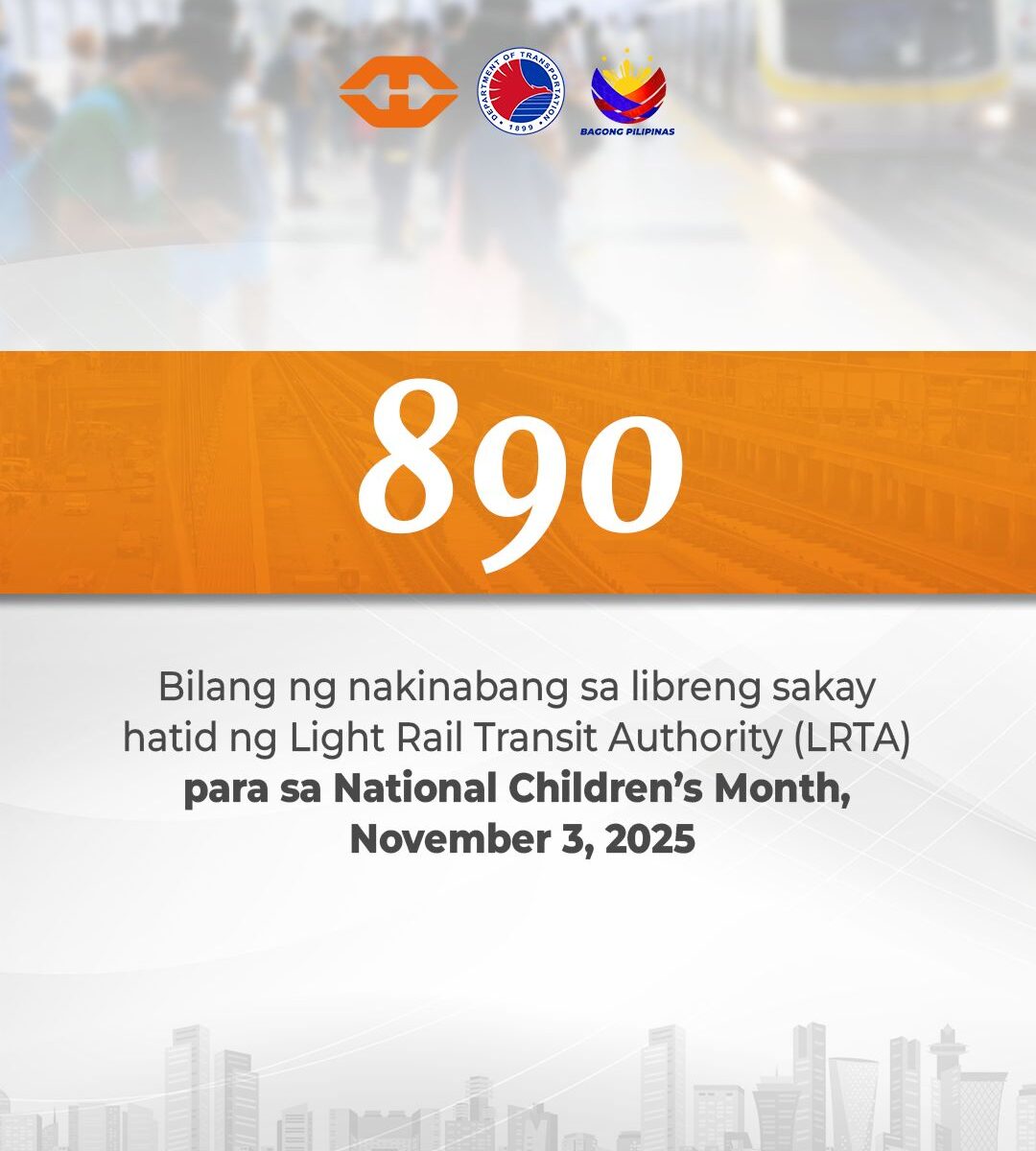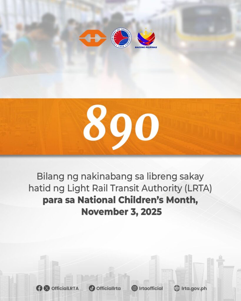 Umabot sa 890 na kabataang pasahero ang nabigyan ng libreng sakay ng Light Rail Transit Authority (LRTA) kahapon, Nobyembre 3, 2025 sa pagdiriwang ng National Children’s Month.