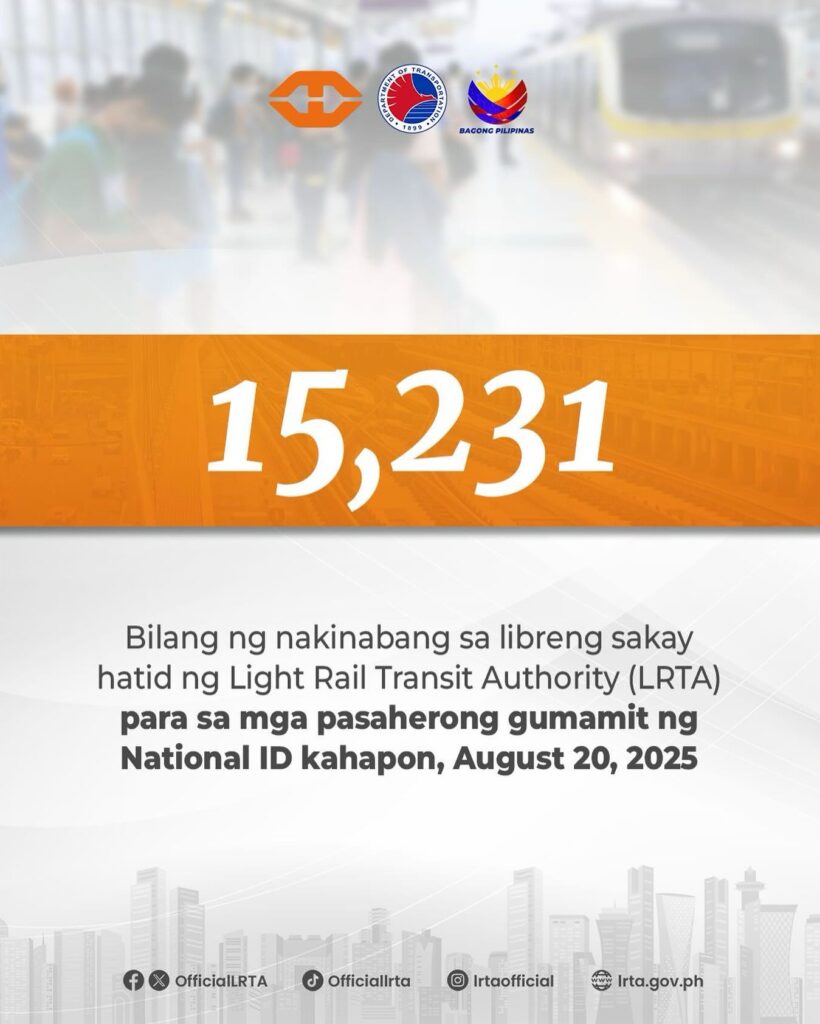 Noong Agosto 20, 2025, umabot sa 15,231 na pasahero ang nakinabang sa Libreng Sakay ng Light Rail Transit Authority (LRTA) gamit ang kanilang National ID.