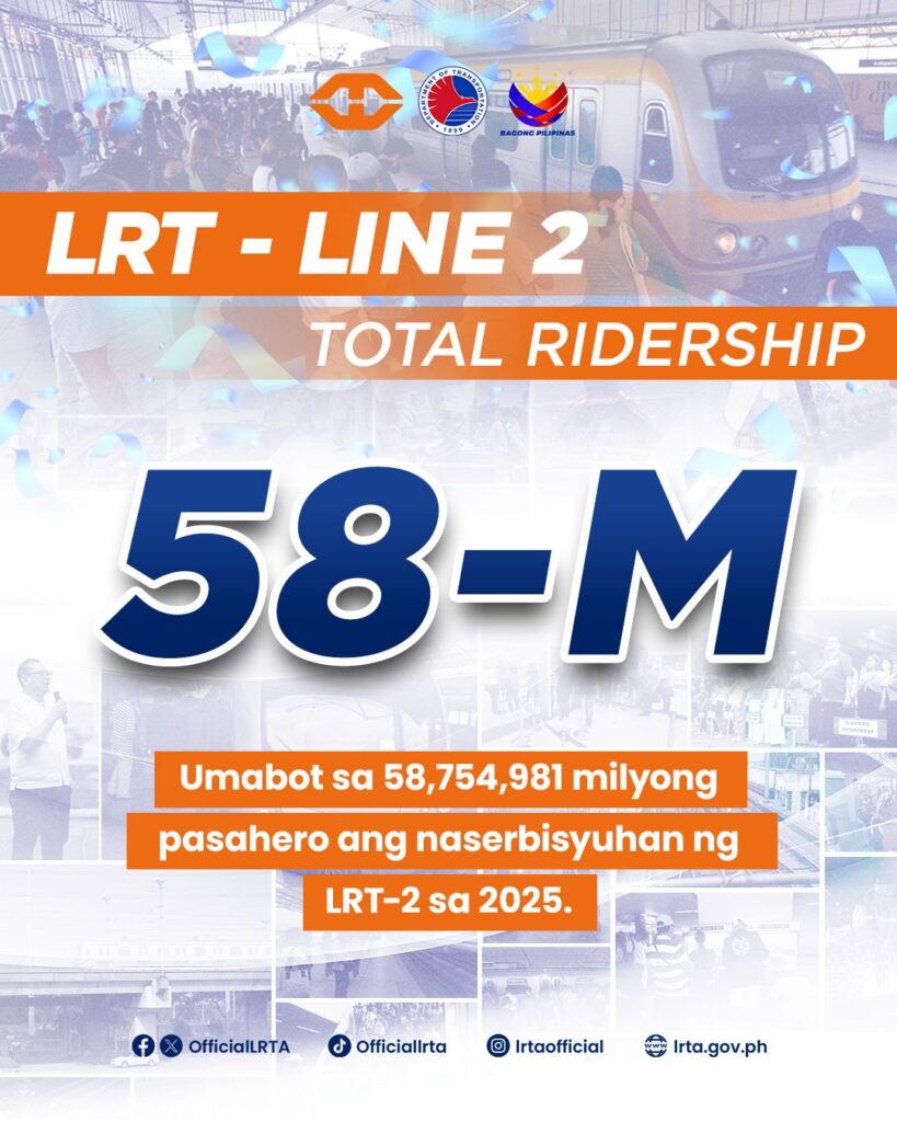 Umabot sa 58,754,981 na #PasaHeroang matagumpay na naserbisyuhan ng LRT Line 2 sa buong taon ng 2025.