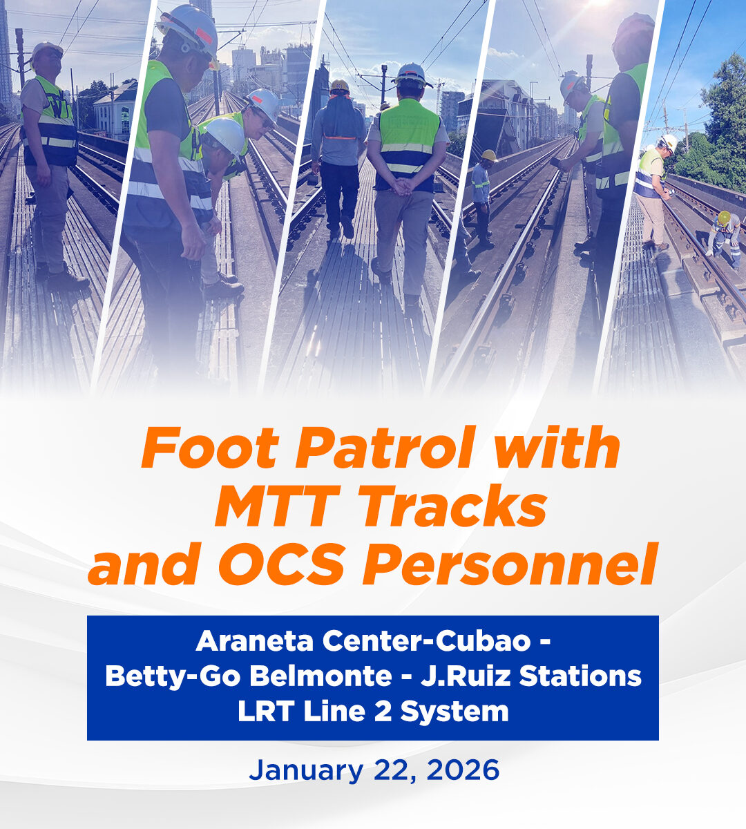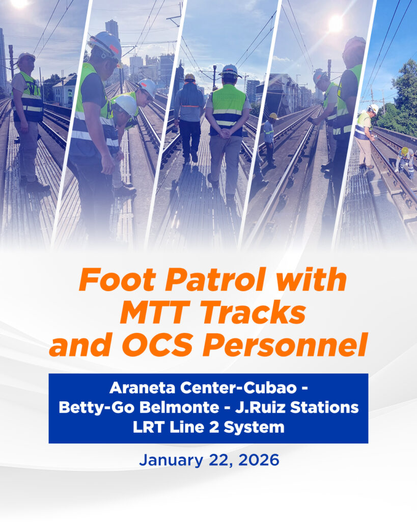 Bilang bahagi ng regular at patuloy na proactive maintenance measures ng Light Rail Transit Authority (LRTA), ang foot patrol na isinasagawa ng Tracks Team at Power Catenary Team ay kabilang sa kanilang pang-araw-araw na gawain sa mainline.