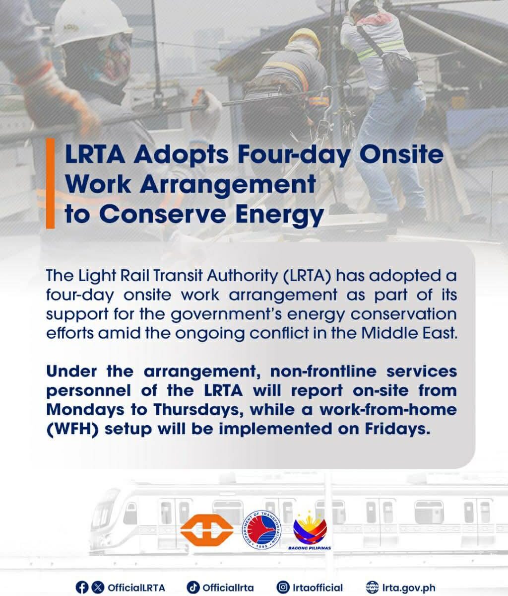 The Light Rail Transit Authority (LRTA) has adopted a four-day onsite work arrangement as part of its support for the government’s energy conservation efforts amid the ongoing conflict in the Middle East.