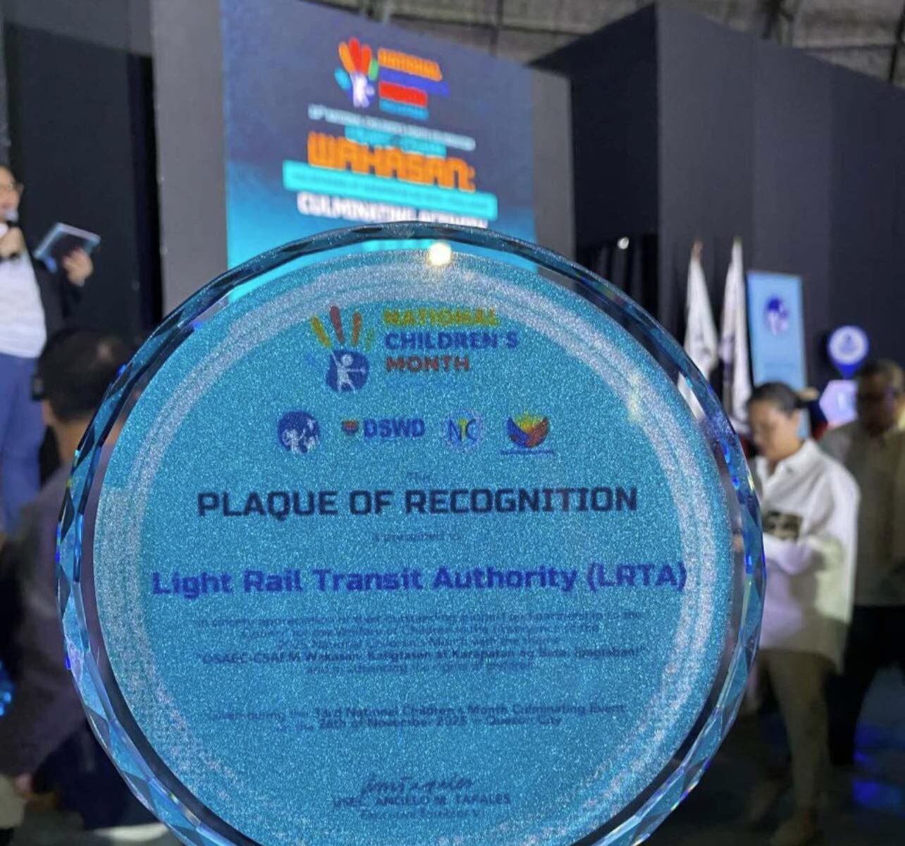 Nakatanggap ng parangal ang Light Rail Transit Authority (LRTA) mula sa Council for the Welfare of Children (CWC) bilang pagkilala sa mahalagang ambag nito sa pagdiriwang ng 33rd National Children’s Month na ginanap noong Nobyembre 26, 2025. Iginawad ang parangal para sa mga inisyatibong ipinatupad ng LRTA upang pangalagaan ang kaligtasan at karapatan ng mga kabataan.
