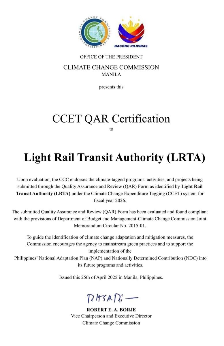 The Light Rail Transit Authority (LRTA) has been awarded the Climate Change Commission Expenditure Tagging (CCET) Quality Assurance and Review (QAR) Certification, confirming that LRTA meets standards for its climate-tagged programs and projects for fiscal year 2026. see full details here.