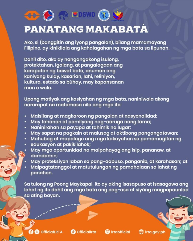 The Light Rail Transit Authority (LRTA) has officially launched the celebration of ๐๐๐๐๐๐๐๐ ๐๐๐๐๐๐๐๐๐’ ๐๐๐๐๐ (NCM) with FREE rides for children and youth below 18 years old on November 3, 2025, alongside the recitation of the Panatang Makabata during the Monday flag ceremony.